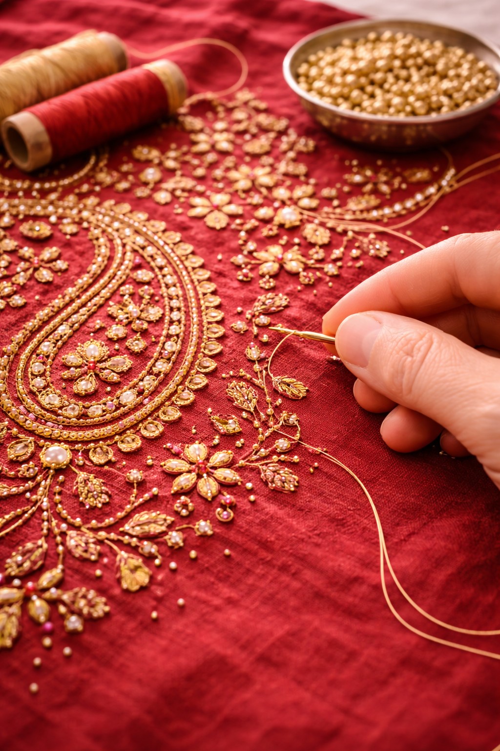 Traditional Indian embroidery using aari needle to create fine chain stitches, delivering intricate patterns with smooth, flowing precision.